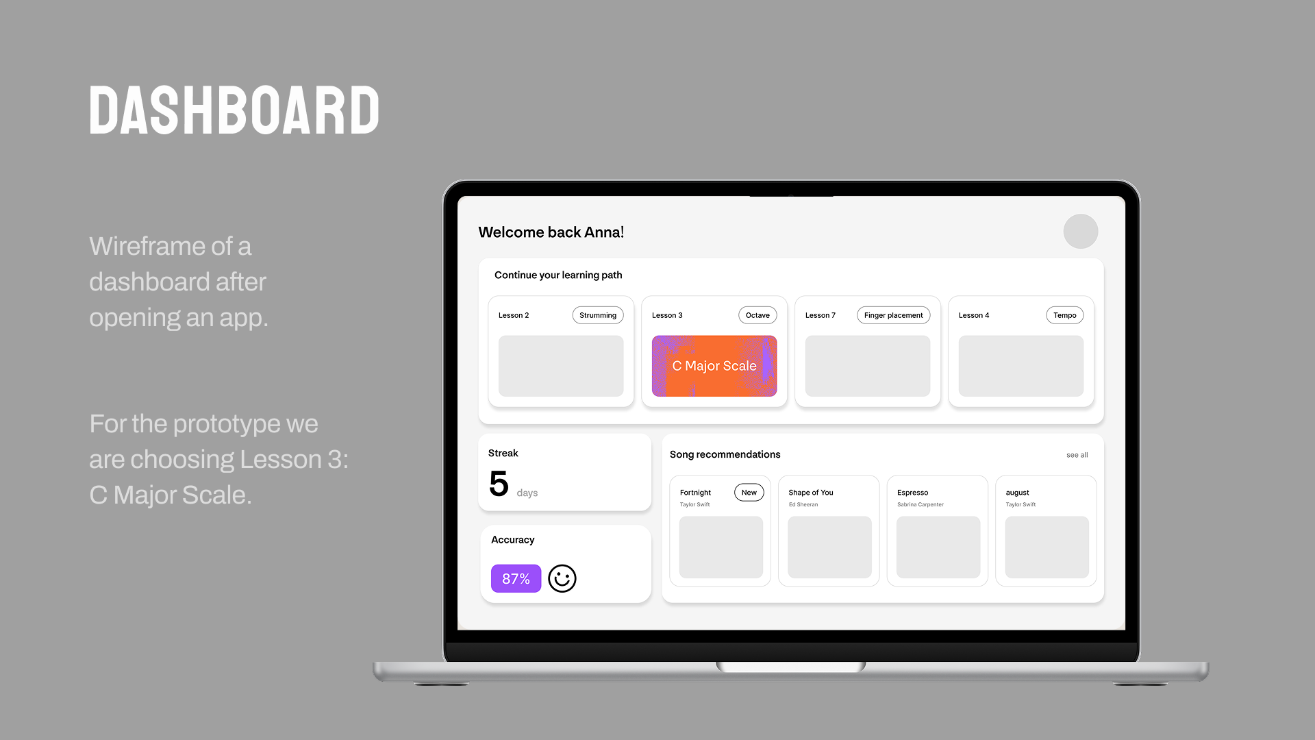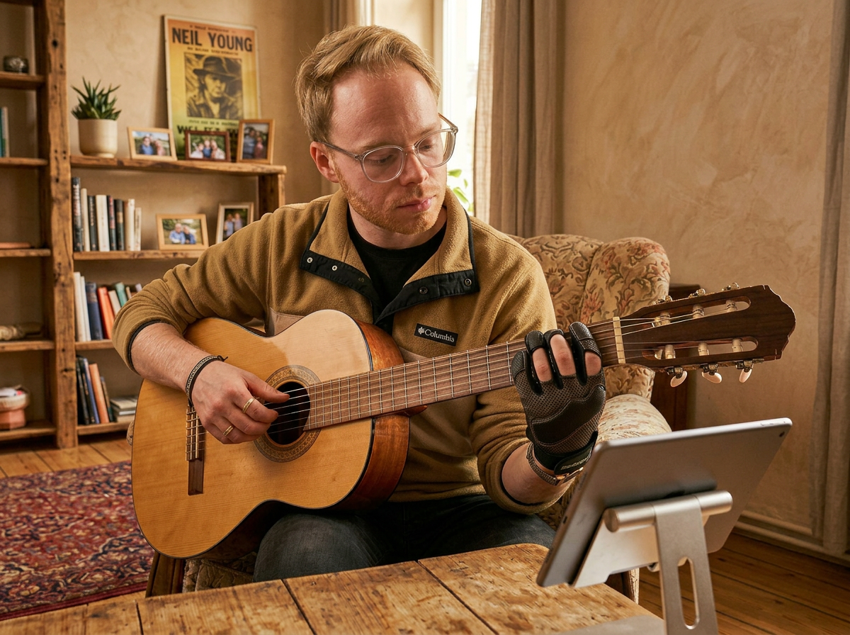 Young adults learning to play the guitar at home, without any teacher involved, lack real-time feedback on their technique, posture, and progress, making self-directed practice frustrating and inefficient. This results in prolonged learning curves, demotivation, and high dropout rates, as beginners struggle to identify and correct mistakes independently. In an ideal scenario, they would receive intuitive, playful feedback—like a virtual instructor—enabling joyful, rapid mastery of the instrument from home, while creating a unique market opportunity for guitars with integrated learning technology unmatched by competitors.