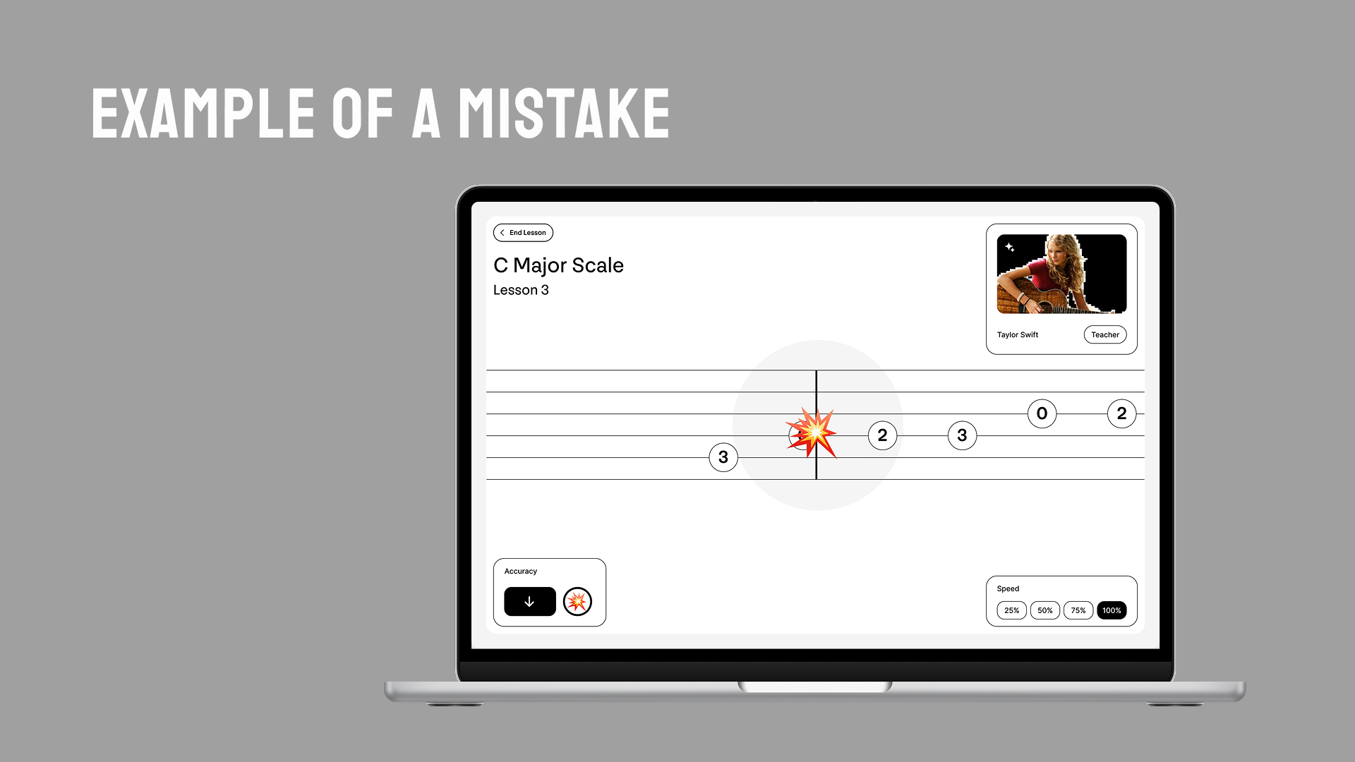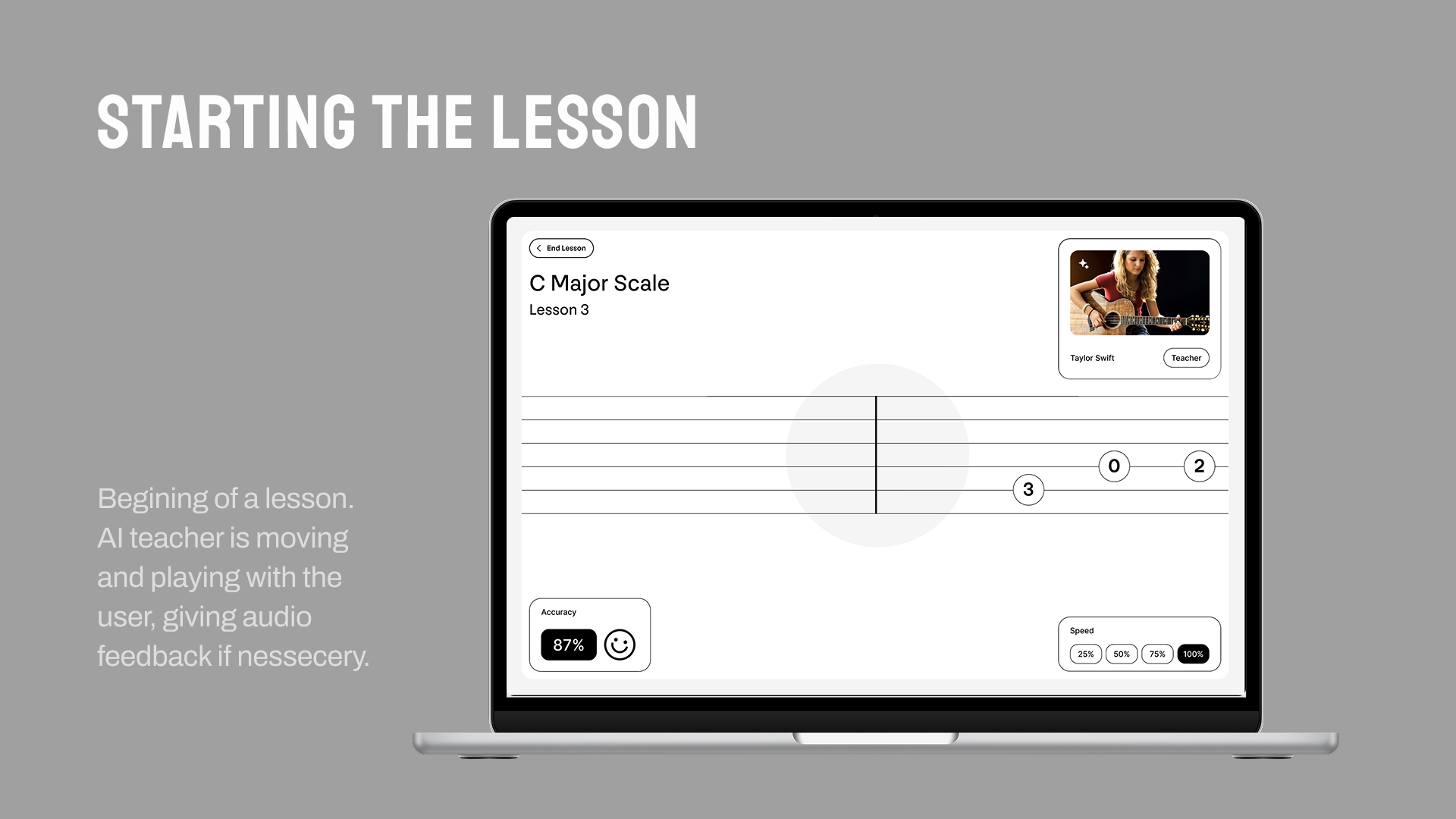 Learning to play the guitar is a popular hobby, but many beginners struggle with self-directed practice at home. Without real-time feedback on their technique and progress, they often become frustrated and demotivated, leading to high dropout rates. A virtual instructor that provides intuitive, playful feedback could transform the learning experience, enabling joyful, rapid mastery of the instrument from home.