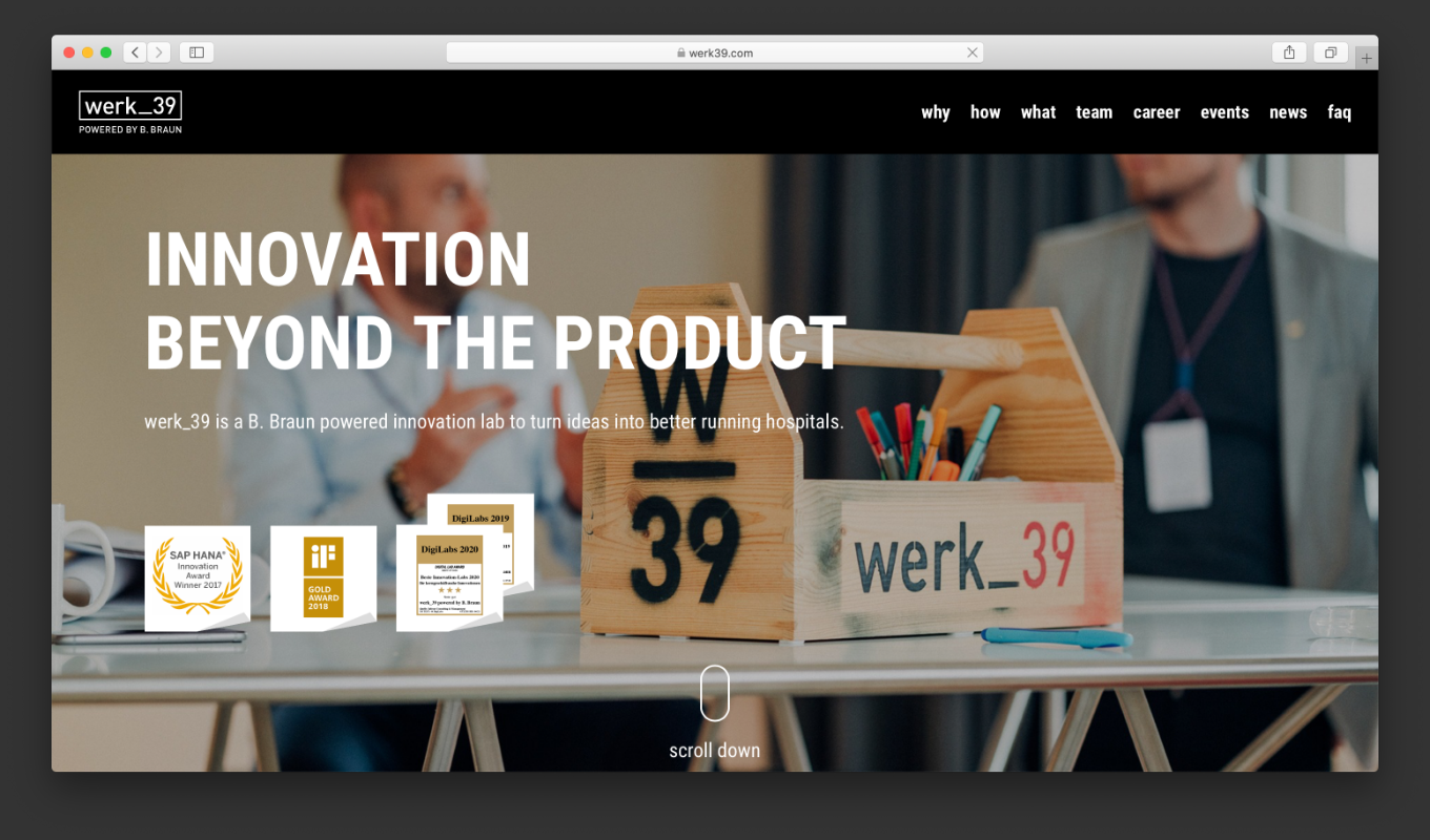 werk_39 is B. Braun's innovation laboratory. The subtitle “Beyond the product” makes it clear that it is about more than just the product itself. Projects that are worked on here are mostly about services, solutions and business model innovations, which I was able to work on as a UX/UI design intern on the front line. Initially, I supported my supervisor in projects, but later I was allowed to independently supervise projects from a service design perspective and take on the visual implementation.